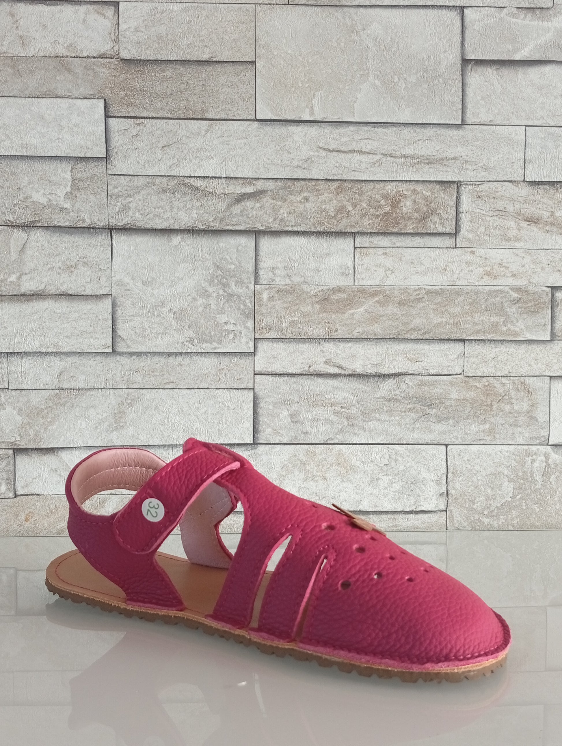 Fabriquées en cuir naturel fuchsia premium, sans renforts rigides, elles laissent le pied bouger librement. Leur joli papillon décoratif en cuir naturel à finition légèrement nacrée apporte une touche délicate et ludique.
